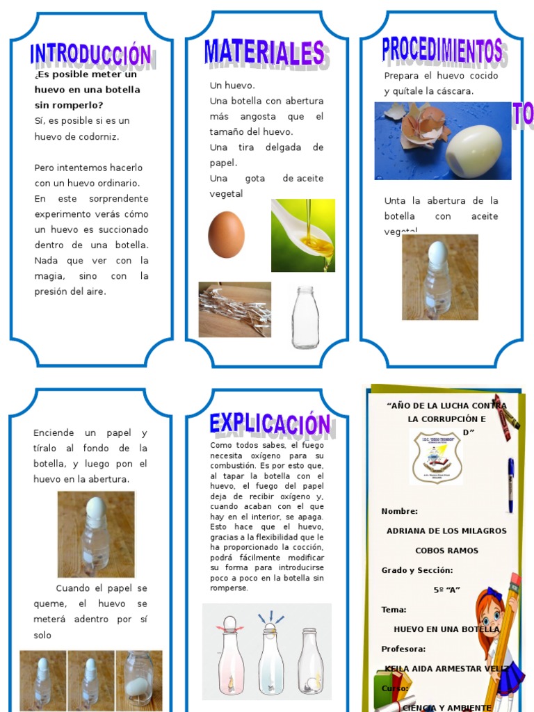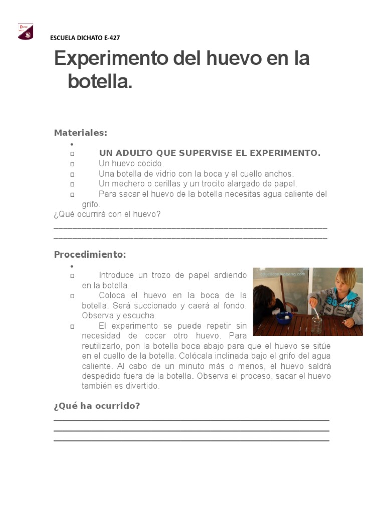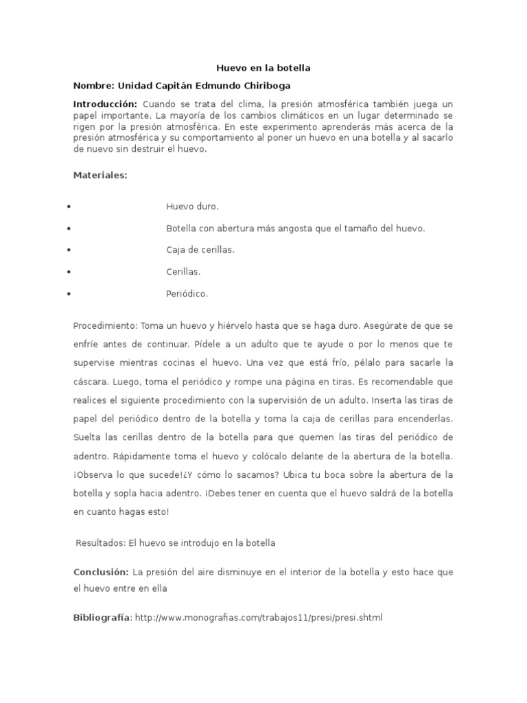 Seremos capaces de insertar un huevo en una botella con un cuello más pequeño que este sin romper el huevo. Todo lo que sucede es gracias a la presión menor posible de aire que existe dentro de la botella. Sacamos el huevo del pico. Lo que sucede aquí es que el calor del fuego ya sea por el papel quemándose o por las cerillas calienta las moléculas de aire dentro de la botella y hace que estas se muevan unas lejos de otras que se dispersen y se forme lo que los científicos dan en llamar un vacío parcial. Como hacerlo1- Lava y seca bien la botella2- Coloca la botella verticalmente y coloca dentro un papel prendido fuego3- Coloca rápidamente el huevo en la bo. Procedimiento del experimento del huevo en una botella. El aire del interior de la botella se calienta con la llama y por tanto la velocidad de sus moléculas aumenta.